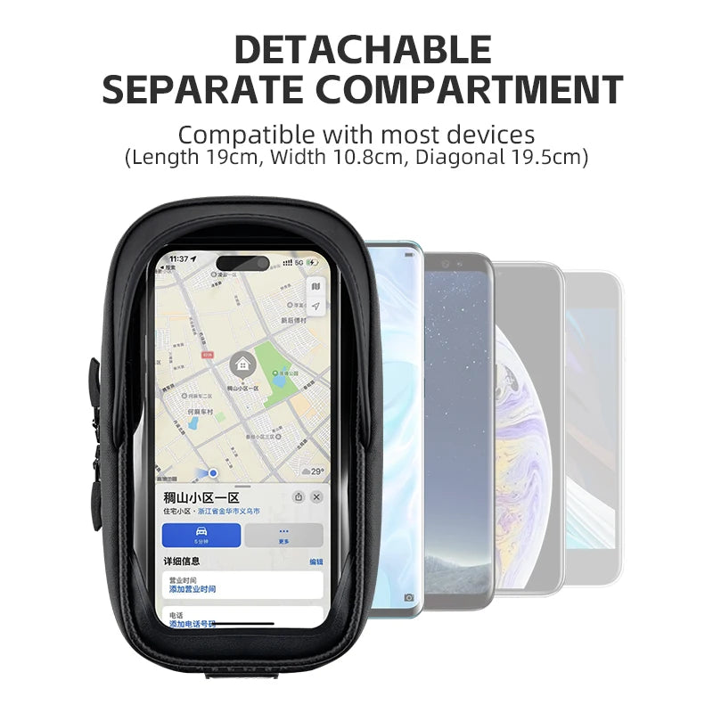 The TPU sensitive touchscreen allows for seamless phone operation during rides, while the 1.3L capacity provides space for tools, keys, or headphones. With a reserved charging hole, reflective safety logos, and a 3-point hook and loop attachment system, it ensures stability, convenience, and safety on every ride.