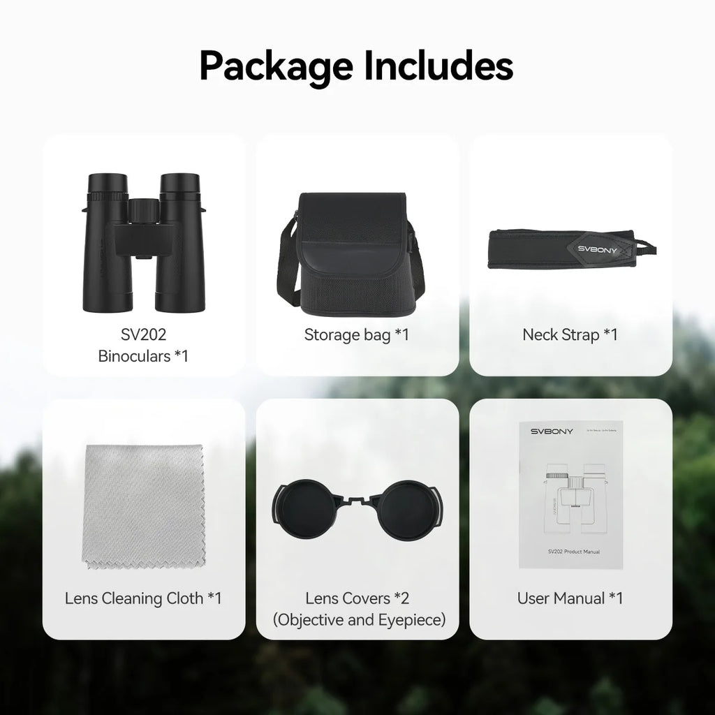 Discover crystal-clear outdoor viewing with the SVBONY SV202 ED Binoculars, built for birdwatching, hiking, sports, and wildlife observation. Equipped with extra-low dispersion (ED) glass and fully multi-coated (FMC) BAK4 prisms, these binoculars deliver exceptional brightness, colour accuracy, and edge-to-edge sharpness.