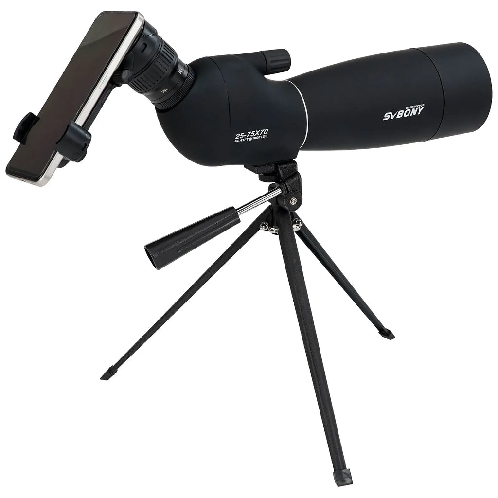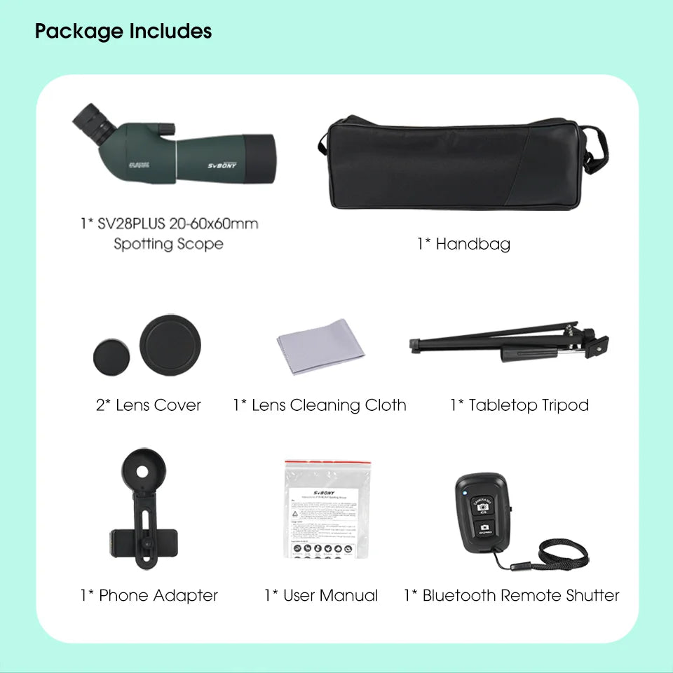 Experience exceptional clarity with the SVBONY SV28PLUS Spotting Scope, designed for archery, target shooting, birdwatching, and wildlife observation. Featuring a powerful 25x–75x zoom and FMC-coated BAK4 prism, this scope delivers bright, high-contrast images with excellent light transmission.